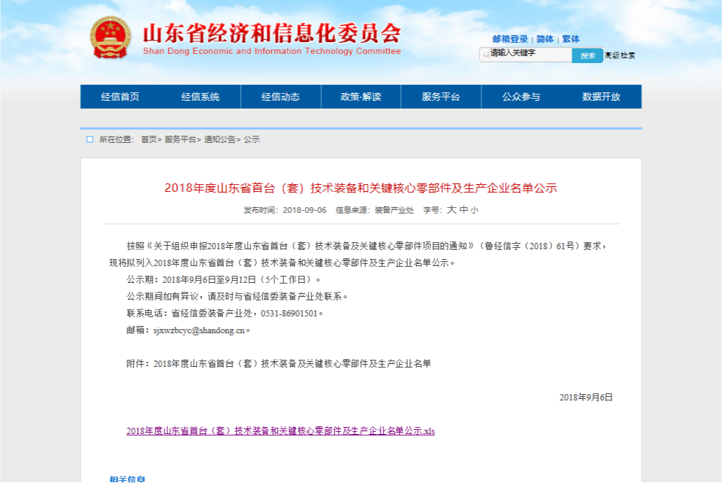 2018年度山東省首臺(套)技術裝備和關鍵核心零部件及生產企業名單公示