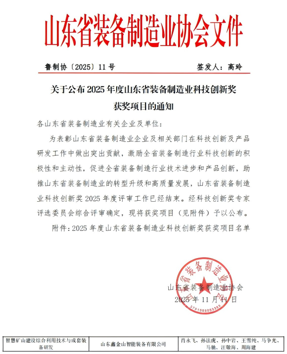 近日,山東省裝備制造業(yè)領(lǐng)域傳來(lái)重磅捷報(bào) —— 由山東鑫金山智能裝備有限公司自主研發(fā)的 “智慧礦山建設(shè)綜合利用技術(shù)與成套裝備研發(fā)” 項(xiàng)目,在 2025 年度山東省裝備制造業(yè)科技創(chuàng)新獎(jiǎng)評(píng)選中脫穎而出,榮膺一等獎(jiǎng)!這一省級(jí)權(quán)威榮譽(yù),是對(duì)鑫金山科技創(chuàng)新實(shí)力的高度認(rèn)可。