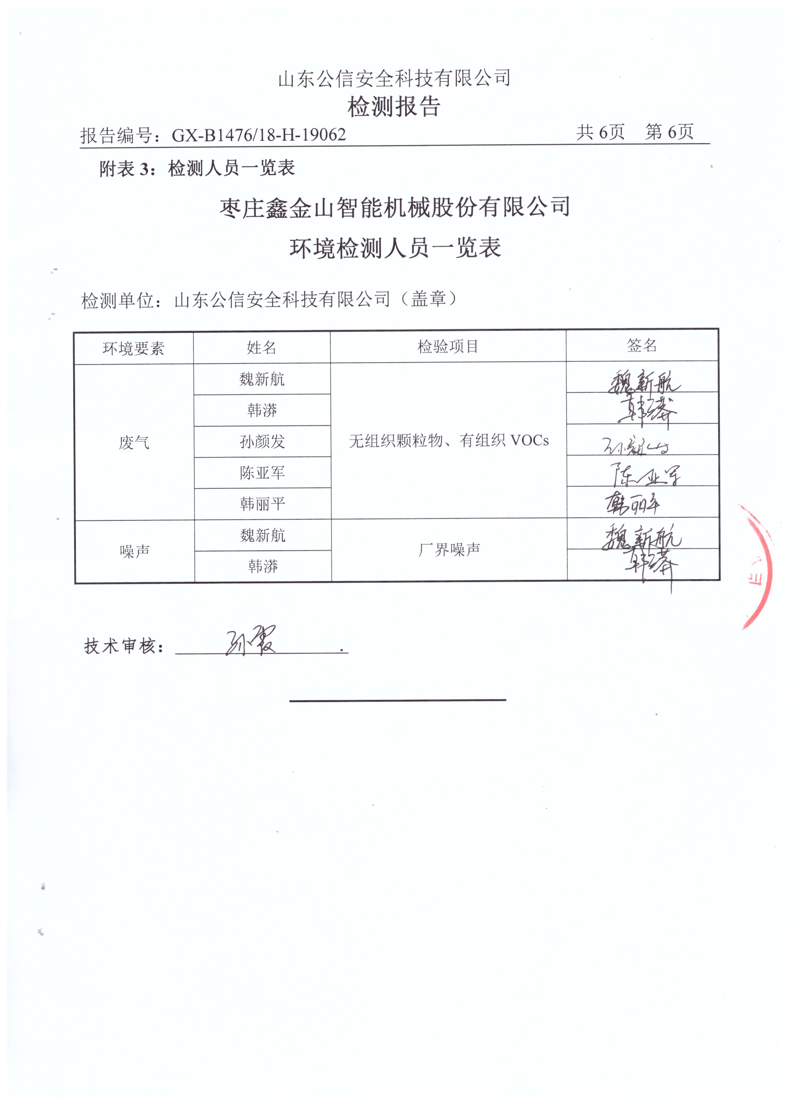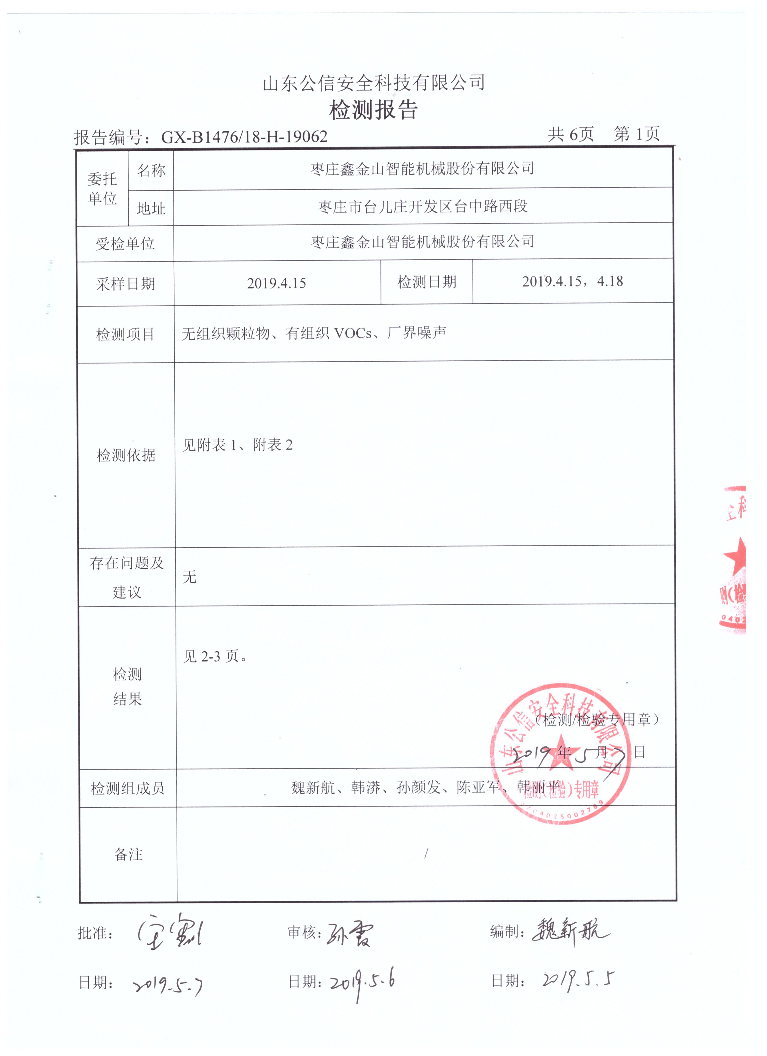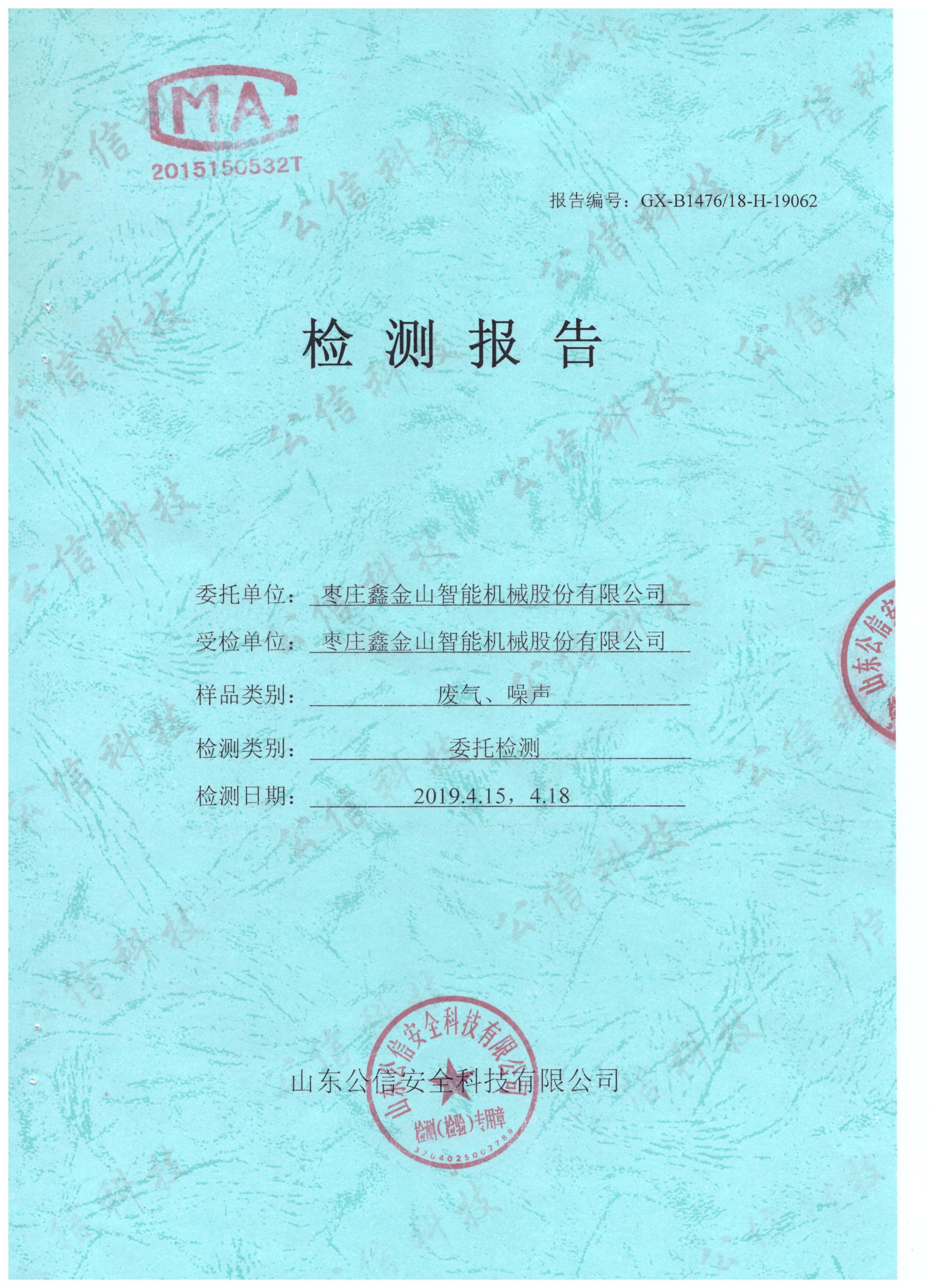 導讀:受檢單位:棗莊鑫金山智能機械股份有限公司 委托單位:山東公信安全科技有限公司 檢測日期:2019.4.15 2019.4.18