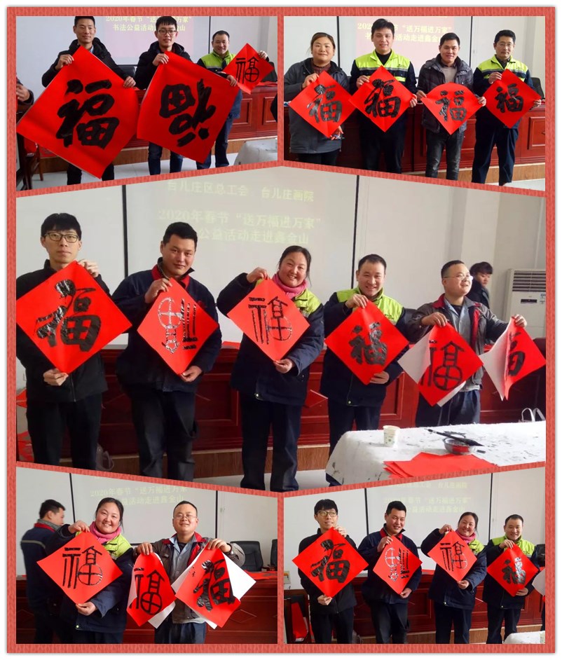 新春將至,為深入宣傳習(xí)近平新時(shí)代中國(guó)特色社會(huì)主義思想和黨的十九屆四中全會(huì)精神,弘揚(yáng)中華優(yōu)秀傳統(tǒng)文化,增強(qiáng)職工的幸福感,營(yíng)造文明、健康、祥和的節(jié)日氛圍。1月10日上午,臺(tái)兒莊區(qū)總工會(huì)、臺(tái)兒莊畫(huà)院組織優(yōu)秀書(shū)法家走進(jìn)鑫金山,開(kāi)展2020年春節(jié)“送萬(wàn)福進(jìn)萬(wàn)家”書(shū)法公益活動(dòng),為鑫金山員工們現(xiàn)場(chǎng)書(shū)寫(xiě)“福”字和春聯(lián),送上了歡樂(lè)和春節(jié)祝福。