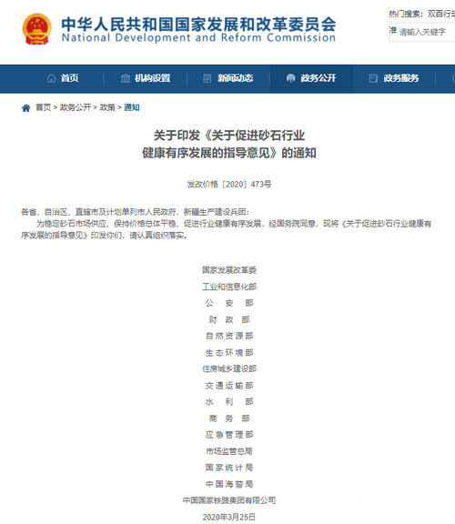 導(dǎo)讀:為穩(wěn)定砂石市場(chǎng)供應(yīng)、保持價(jià)格總體平穩(wěn)、促進(jìn)行業(yè)健康有序發(fā)展,經(jīng)國務(wù)院同意,2020年3月25日,國家發(fā)改委等十五部門和單位聯(lián)合印發(fā)了《關(guān)于促進(jìn)砂石行業(yè)健康有序發(fā)展的指導(dǎo)意見》。