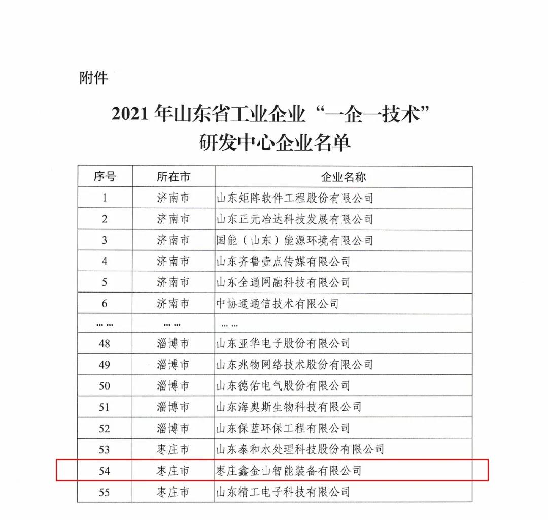 導讀: 鑫金山被認定為山東省一企一技術(shù)研發(fā)中心 近日,山東省工業(yè)和信息化廳發(fā)布《關(guān)于公布2021年山東省工業(yè)企業(yè)“一企一技術(shù)”研發(fā)中心企業(yè)名單的通知》,棗莊鑫金山智能
