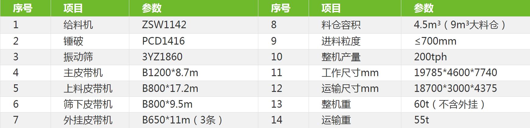 組成:主皮帶機、料倉、給料機、錘破、上料皮帶機、振動篩、篩下皮帶機、車架、外掛皮帶機